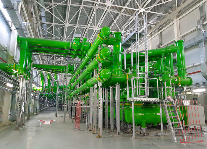 Зелёные «трубы» за нашими спинами на фото- это электрические кабели, ведущие на КРУЭ 330кВ. Комплектное Распределительное Устройство. С его помощью ЛАЭС-2 передаёт своё электричество в единую энергосистему Северо-Запада России. Когда мы вошли внутрь помещения, первым вопросом был:«а устройство не работает»? В зале действительно очень тихо! Мы же привыкли, что раз «трансформатор», значит должен гудеть. А здесь всё работает в тишине. И будет работать очень долго, его обслуживание потребуется только через 7 и 15 лет! Управляется дистанционно, непосредственное присутствие людей не требуется, что снижает опасность и нагрузку на их здоровье.