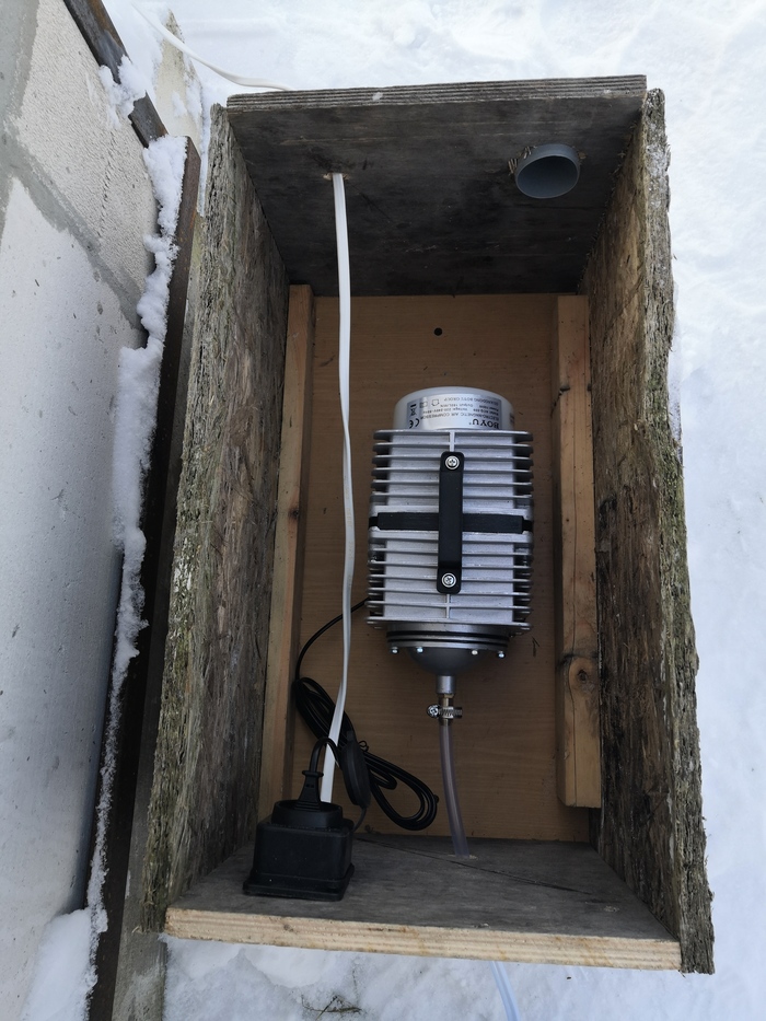 А это сам аэратор. Поставил временно в ящик чтобы снегом не заваливало. Правда пока ещё воюю с конденсатом. То ли из за разницы температур в ящике и наруже набегает. Тоже пока смотрю. Надо будет переделать...