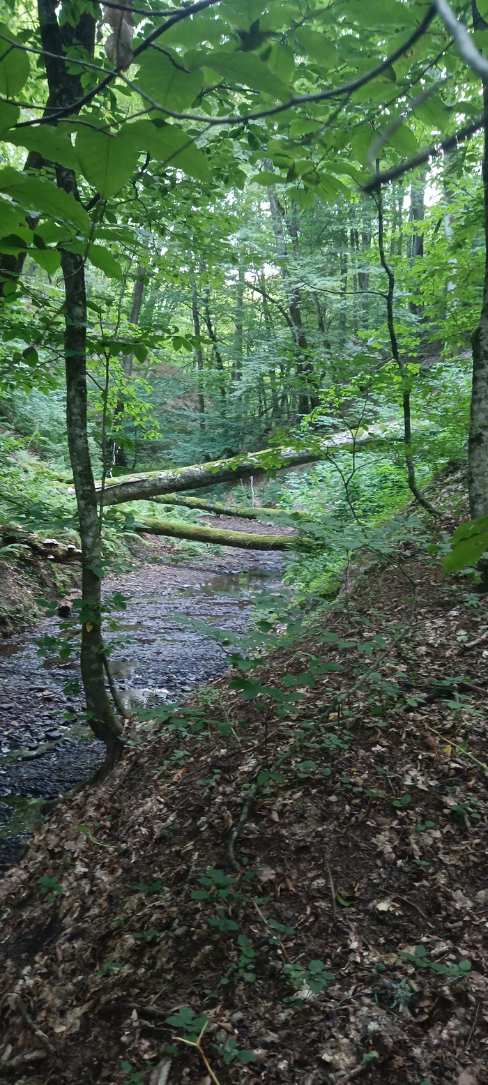 Заставил себя доесть гречку. 1 км вверх по ручью. Прежде чем пойти дальше надо нафильтровать воду, вода в ручье ближе к истоку стала мерзкой, с насекомыми. Видел что тут растёт каштан. Фильтровал воду 2 часа. Поднялся из долины ручья, выбрался на грунтовую дорогу, проходившую по хребтам. Место популярное - дважды видел мотоциклиста. Обедал козинаком. Заметил много смородиновых кустов. Дошёл до речки Гойтх, что рядом с посёлком Горный. Воды в ней не было, зато нашёл воду в одном из её притоков. Мусора тут много. Видел людей рядом. Ночевал прям очень рядом с посёлком. Поэтому костёр не разводил. Спал на подстилке из папоротника, под низкой горизонтальной веткой, вокруг которой обернул тент. Дымил сухими листьями чтобы отогнать комаров. Спалось тепло. Ночью слышал рядом пробегающего кабана.
