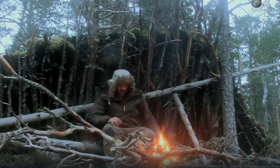 Для разведения костра Эд ищет камни в ручье. Случайно нашёл металлическую скобу. Собрал гриб трутовик. Бьёт металлом по камню высекая искры на гриб. Трутовик затлел, положил его в сухую траву, раздул и получил огонь. Собирает сухие ветки для костра. Делает костёр звездообразной формы. Строит укрытие из сухостоя. Один длинный ствол положил наклонно, оперев на другое дерево. Ровняет брёвна пережигая их в костре. Делает такую кровать: в основании большие камни, на них сухие брёвна, на брёвна лапник, на лапник вереск. Ест можжевельник. Наступила ночь, но крыша ещё не готова.