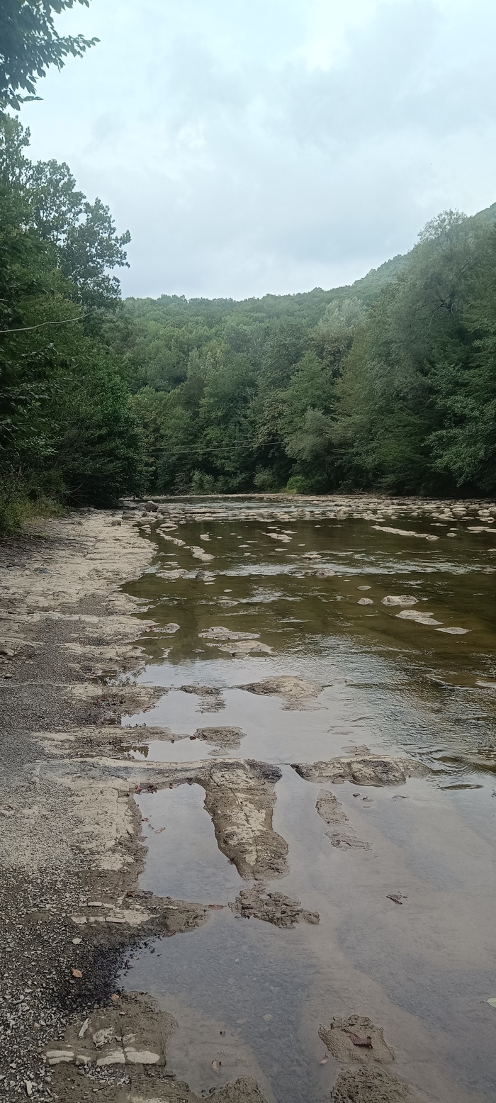 Со свежими силами пошёл дальше вниз по течению. Течение реки кажется уже не такое бурное. Шёл по тропе. Когда тропа упиралась в реку значит надо переходить брод. Перешёл несколько бродов, дошёл до реки Шахе, перешёл, выбрался на дорогу и просто шёл. На КПП заповедника меня спокойно выпустили, не спрашивая документов. По дороге встретил незнакомые мне плодовые деревья. Дошёл до Солохаула, спустился к реке Шахе, искупался, постирался, зашил все свои дырки, вытащил клещей. Там много ездят на джипах с громкой музыкой. Потом пошёл в монастырь, немного подзарядил телефон. Рассказал посетителям о своём походе, один из них мне пожертвовал 1000₽. Спросил можно ли переночевать, и есть ли трапезная в которой можно поесть. Переночевать не получится, а вот поесть мне вынесли: макароны, рыба жаренная, огурцы солёные, свежий хлеб, чеснок и лук.