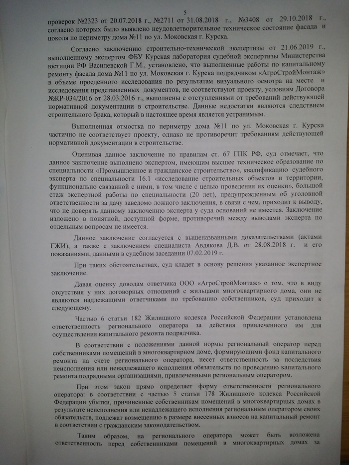 Обстоятельства нашего дела. В 2016 году подрядчик Фонда завершил работы по капитальному ремонту в доме, сдал результат работ. После этого у собственников возникли обоснованные претензии по качеству работ.