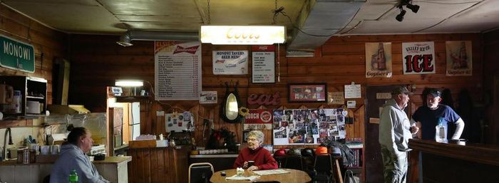 Как и многие бары в Америке, таверна Монови служит своего рода общественной гостиной. В то время, как Элси готовит гамбургеры и хот-доги, клиенты играют в карты, отгадывают кроссворды, делятся новостями, а на меловой доске на стене пишут приглашения на знаменательные семейные события.