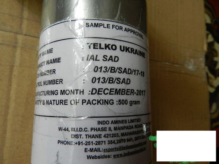 Купил микс-лот на аукционе, в коробке среди прочего было две банки этого. Нагуглил что делают это индийцы их сайт -http://www.indoaminesltd.com НЕ РЕКЛАМА!, банки аллюминиевые, герметично закрыты, внутри -сыпучее. Telco Ukraine занимается - "Поставка химсырья для ПВХ, нефтехимии, полимеров", подозреваю что там какие-то пластиковые гранулы.