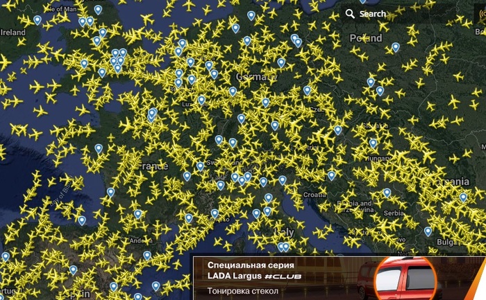 Для примера, вот сколько ПАССАЖИРСКИХ самолётов прямо сейчас только над одной Европой.