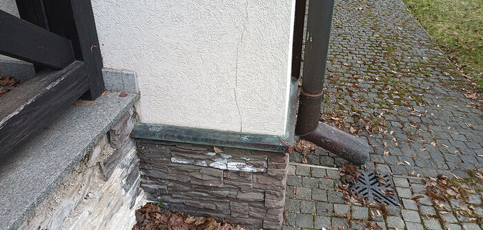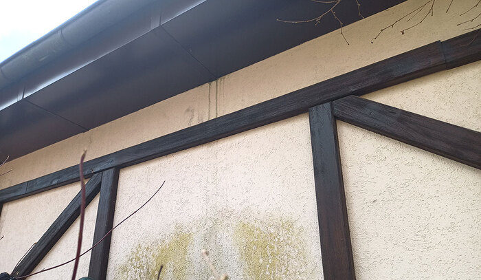 Внешняя отделка под фахверк, выполненная в виде штукатурки и декоративных деревянных элементов, пошла мелкими трещинами по всему периметру здания.