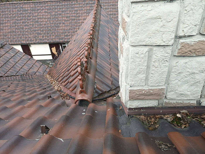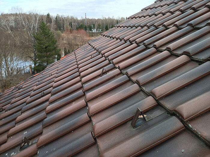 По заверениям риелтора, черепица приехала аж из самой Германии. Но дело в том, что в данной ситуации это не плюс, а минус - найти такой же материал на замену будет сложно. Придётся изготавливать его штучно и затем пытаться попасть в цвет. Однажды я так делал, это непросто. Проще демонтировать крышу другого строения и использовать её как расходник.