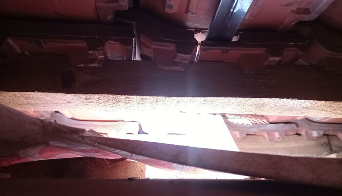 Местами гидроветрозащита отсутствует и мы можем наблюдать солнышко через колотую черепицу.