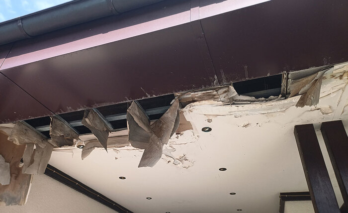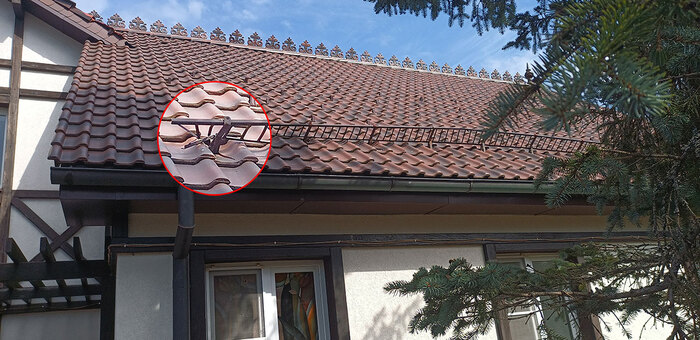 А вот и причина проблем снаружи. В момент первого обхода здания я её даже особо не заметил. Ну, погнуло немного снегозадержатель, бывает. Но по факту - именно этот дефект привёл к неприятным последствиям и это не только протечка.
