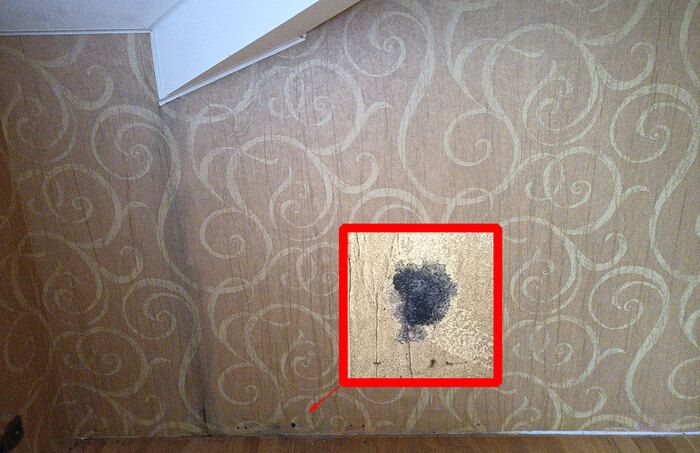 Внутри мы наблюдаем следы протечек по стенам и тут же обнаруживаем грибок. Местами он уже вылез из под обоев.