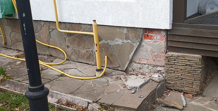 Местами разрушения могли быть устранены косметическим ремонтом, как, например, разрушение декоративной отделки цоколя гостевого домика морозным пучением.
