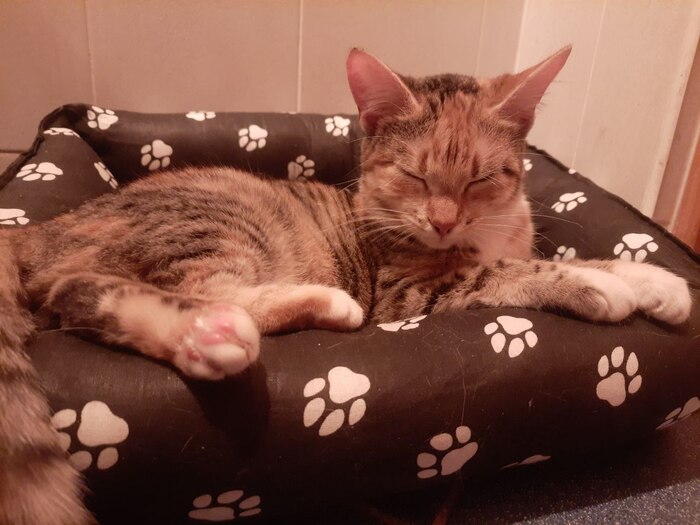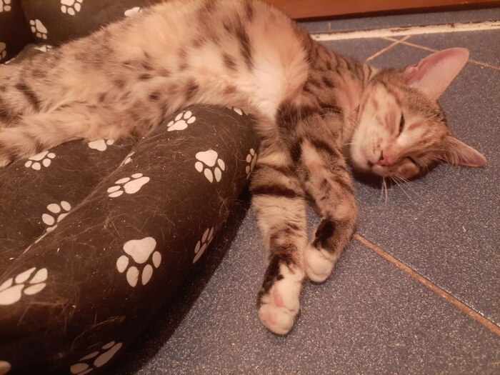 Пока еще обитает в ванной, когда нас нет дома. Ей даже подарили лежанку 🐾