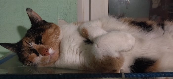 В соседнем подъезде моего дома эта кошка живёт уже 10 лет. Одна замечательная женщина Галина, наверное одна из немногих, кто заботится о ней. И заботится о том, чтобы кошка не мешала никому из жильцов - убирается там, где мисочки, оставляет лоточек.. В хорошую погоду она часто спит на лавочке или гуляет в нашем районе, ведь она уже привыкла здесь..