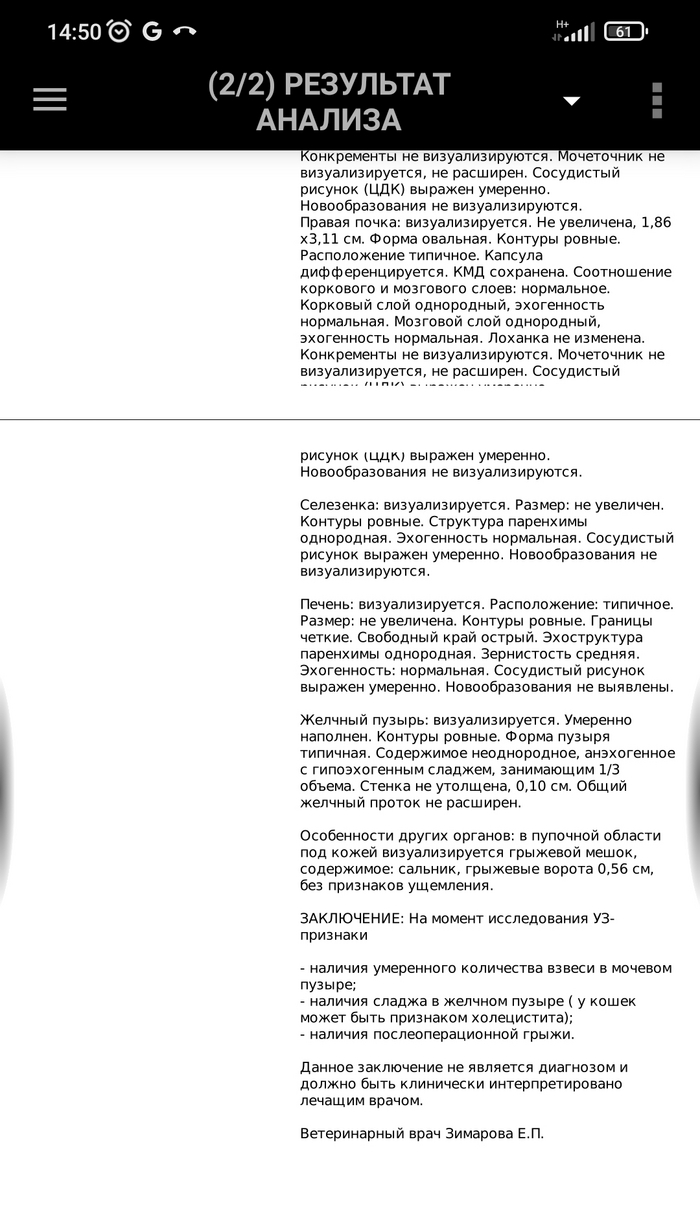 А ведь ей ещё нужно было сделать цистоцентез (когда мочу берут проколом под контролем УЗИ) и сдать на микробиологический посев, чтобы понять какая причина этому. И вообще попасть к нефрологу нормальному.