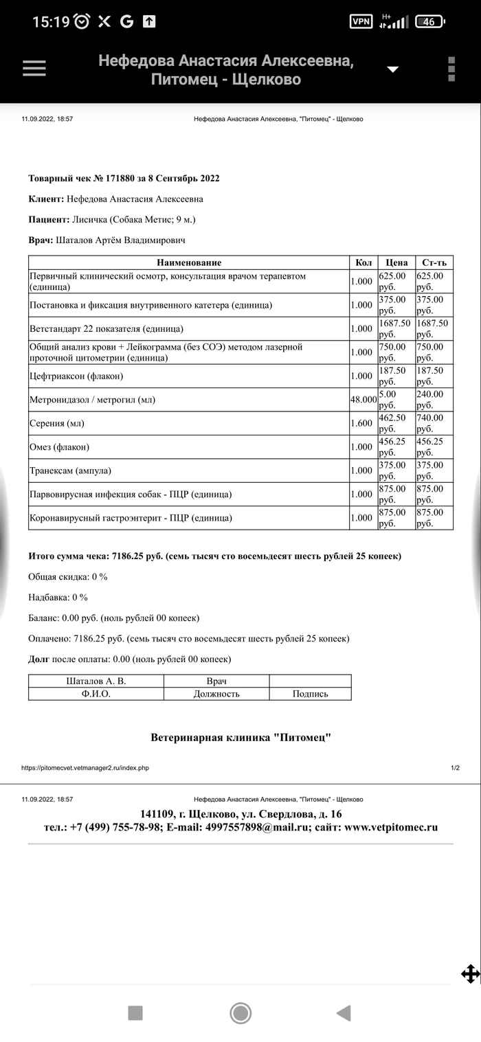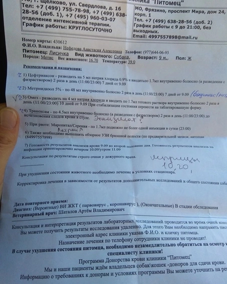 Энтерит. Весной мы потеряли трёх щенков из этого помёта из-за этого. Я не думала, что все придется заново проходить - ведь Лисичке было уже 9 месяцев, щенячий рубеж уже пройден. Очевидно, она была носителем вируса или поствакцинальные последствия, я не знаю. Из-за нещенячьего возраста и БЛАГОДАРЯ замечательной Светлане, хозяйке передержки, Лисонька поправилась.