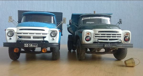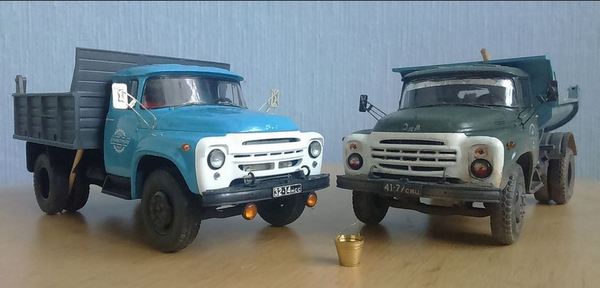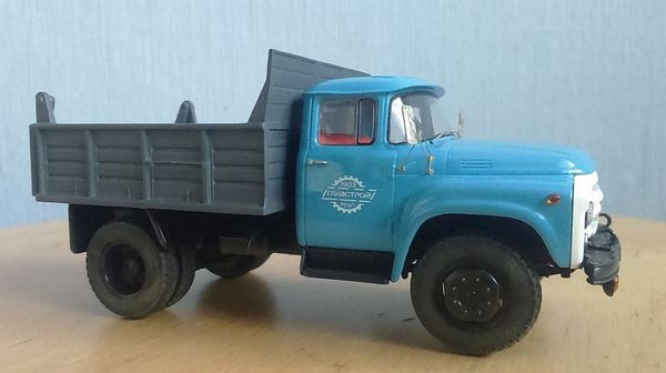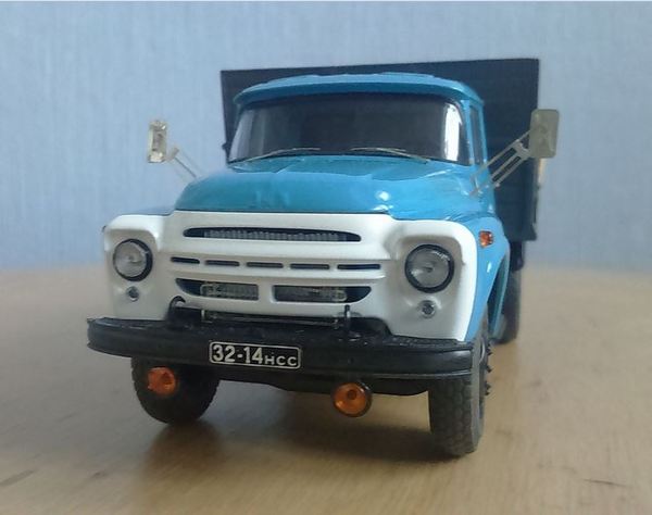 Кит "AVD", грунт "Кудо", окраска кабины эмалью "Мобихел" в типично зиловский цвет "Адриатика -425", кузова - "Звезда акрил" беличьей кистью, китовая светотехника окрашена лаками "Тамия" + фары "ТриА". Поставлен на учет, приписан к АТП. Немного припылил колеса, ступеньки пудрой " Тамия".