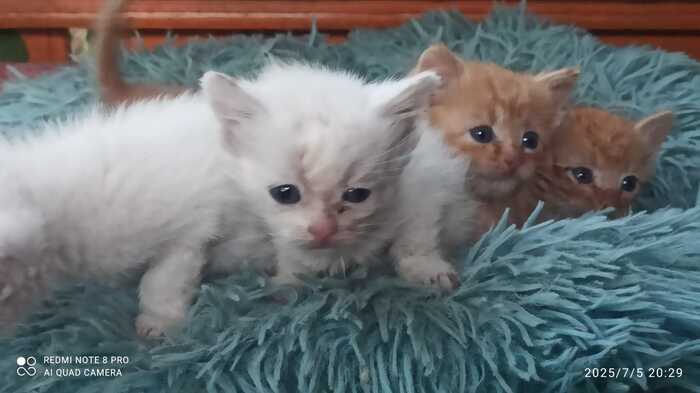 Срочно пристраиваются котята, возраст не больше месяца. Нашли коробку на дороге, малыши одни без матери. Только начали сами кушать. Так как еще очень маленькие, пол понять сложно. Три рыжика, и два белых. Находятся в районе Серебряных прудов, МО. Доставка по Москве и области.