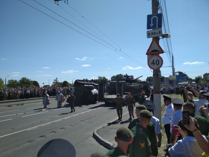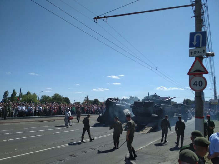 Перевернутый танк во разъезда техники после парада посвященного 75 летней годовщине Курской битвы.