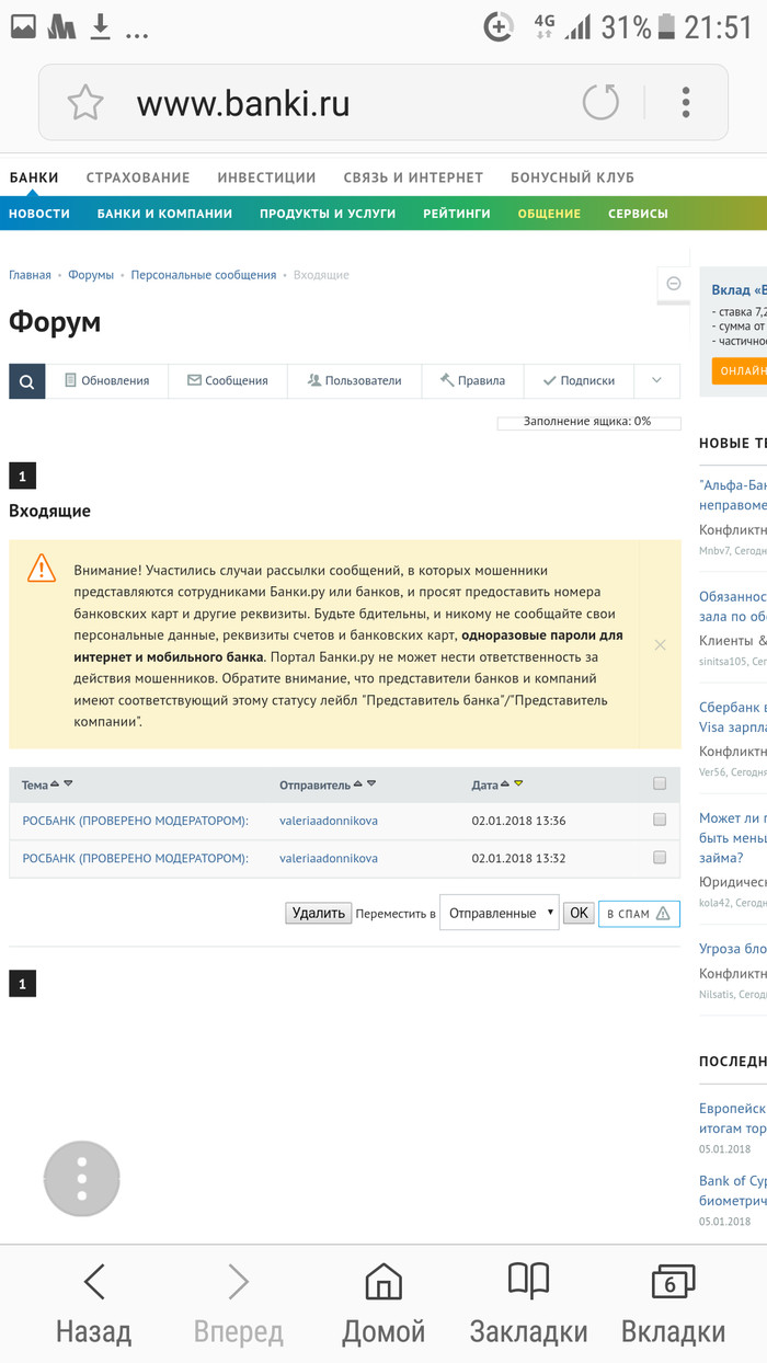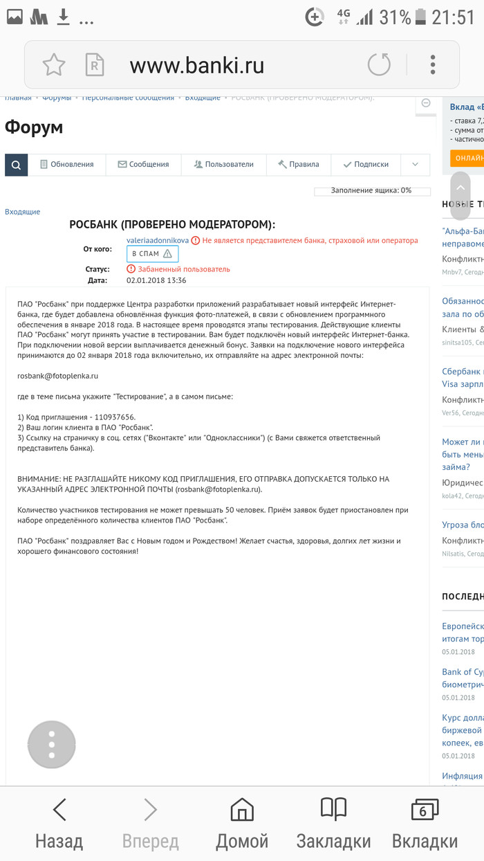 Будучи введенным в заблуждение и немного в состоянии эйфории от того, какой у меня чудесный банк я сам отправил мошенникам свой логин и сомнения стали закрадываться когда на телефон пришел код подтверждения операции от банка и следом второй. Мадам по почте меня торопила и просила выслать ей код для регистрации меня участником программы. Благодаря тому что связь то ловила, то нет смс я получил с задержкой. И я таки выслал первый код, когда уже получил второй и тут до меня наконец дошло, что я совершил глупость. Я открыл и перечитал сообщение от пользователя на сайте банки.ру и увидел предупреждение портала о случаях мошенничества и пометку о том, что пользователь забанен.