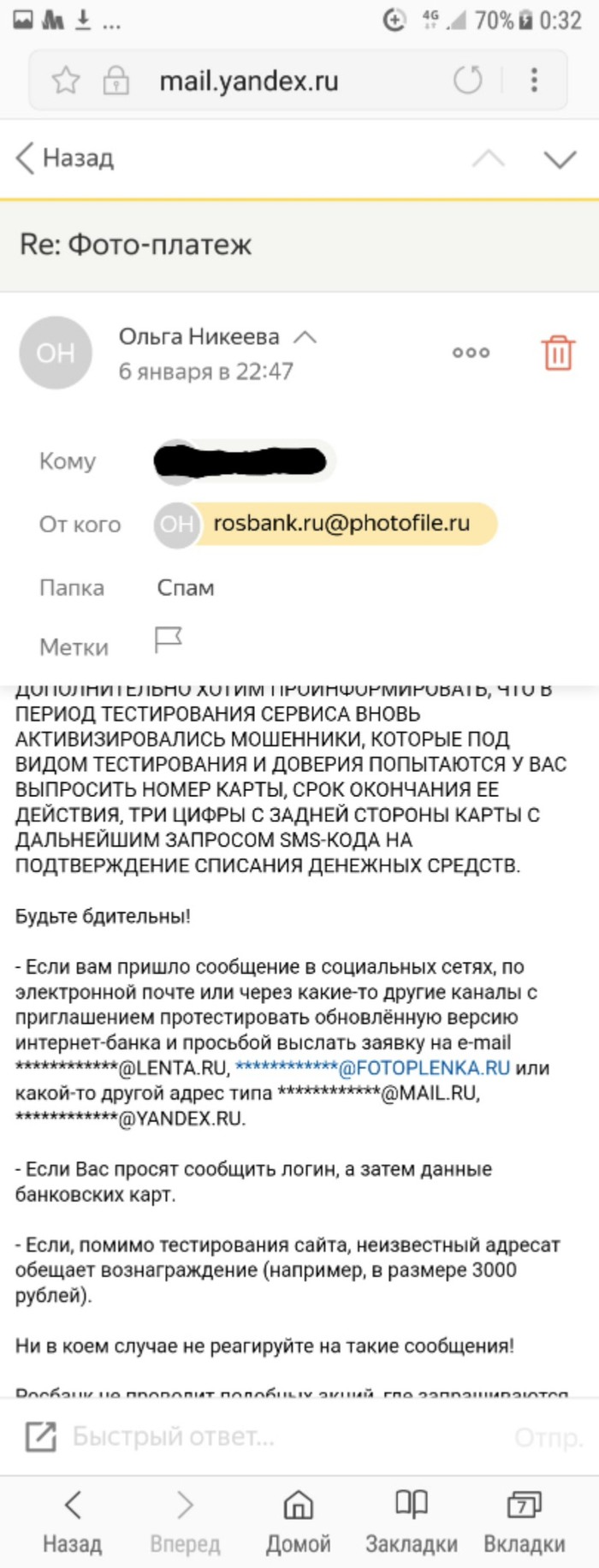 Представители банка оперативно ответили, принесли свои извинения и пообещали компенсацию, бесплатное обслуживание за период, когда были причинены неудобства. Каким-то образом этот отзыв мне прельстил и когда в почтовом ящике я увидел сообщение якобы от представителя банка с предложением поучаствовать в тестировании новой функции фотоплатежа, то вообще почуствовал себя королем.