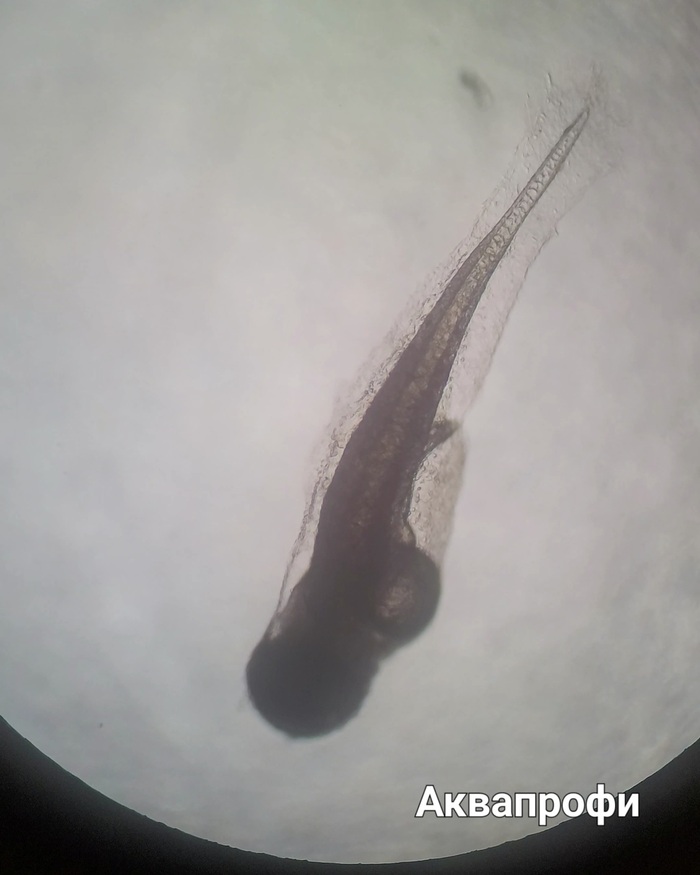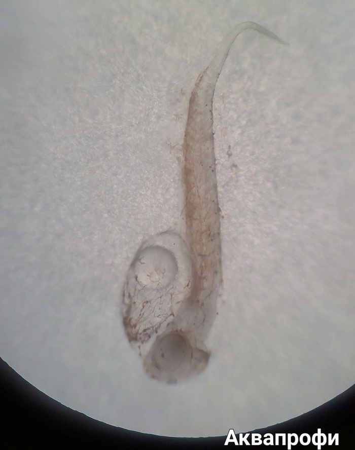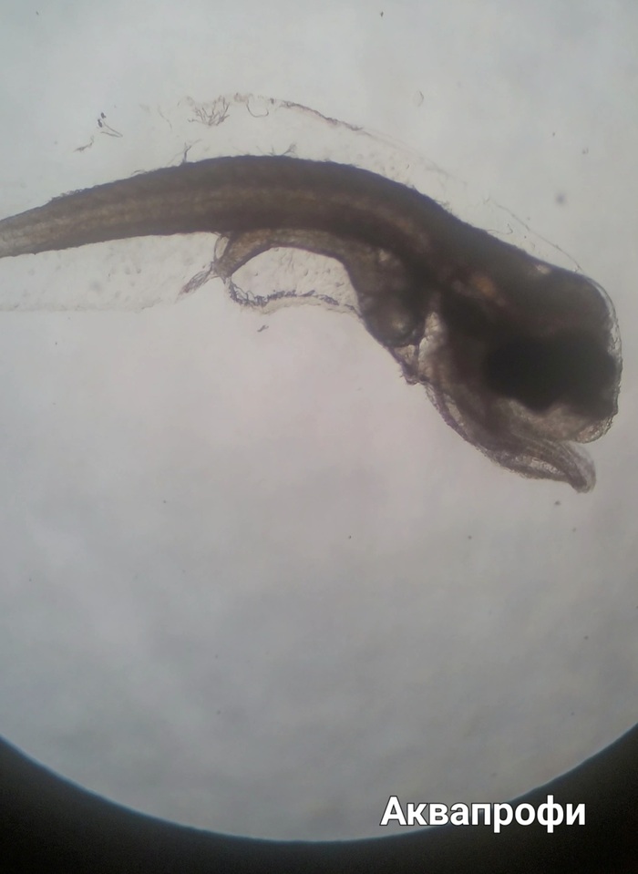 Личинка золотого каранга - второй день после вылупления из икры. Личинка потемнела, желточный мешок значительно уменьшился, но рот еще не появился.