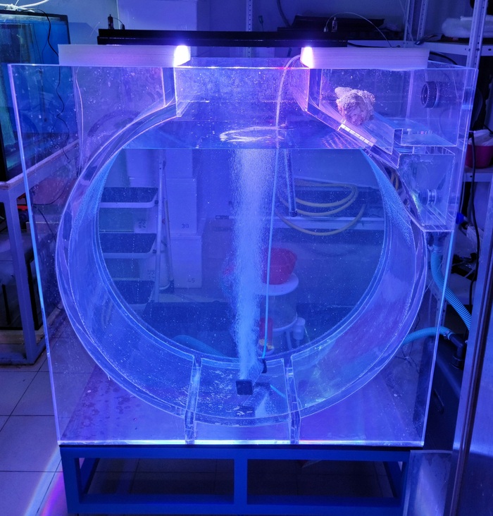 На счастье, не так давно до описываемого момента, мы закончили строительство новой экспозиции - медузятников (об этом расскажу в отдельном материале), и специально для будущего размножения медуз я заказал два небольших медузятника для карантина. Медуз в карантинных аквариумах на тот момент не было, но вода была давно залита и биофильтрация запущена. Я перелил в каждый аквариум по половинке воды из ведра с икрой. Предварительно я отключил фильтрацию в аквариумах и поставил мощную аэрацию от компрессора. Над медузятником я установил яркий светодиодный светильник, чтобы попытаться визуально наблюдать за икрой и снять видео. Над кубиком был лишь не яркий строительный прожектор.