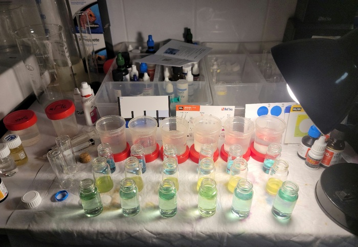 Теперь нужно было подумать, как организовать инкубацию икры - в 15 литровом ведре с распылителем её оставлять было нельзя. Пришлось искать свободные емкости с устоявшейся морской водой в карантине. Я давно знаю, что использовать свежеприготовленную морскую воду для инкубации икры нельзя ни в коем случае - это приведет к гибели икринок. Лучше всего брать воду из того аквариума, где содержатся производители, но по чистоте и составу микроорганизмов такая вода не всегда подходит для оптимального развития икринок. Поэтому я обычно начинаю инкубировать икру в воде из аквариума, а потом постепенно частями заменяю её на устоявшуюся свежую. Специальными инкубаторами для икры я не богат, пришлось использовать то, что было в наличии и не занято. Чтобы буквально не класть все яйца в одну корзину, я решил поместить икру в два разных аквариума. Один двухсотлитровый аквариум кубической формы, а другой - специализированный аквариум-карусель для выращивания медуз.