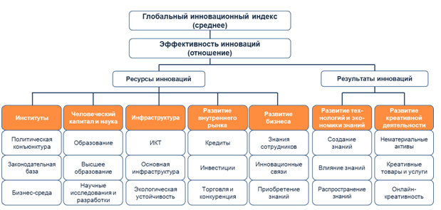 Это уже 11 подобное исследование. 80 индикаторов инновационной деятельности разделены на шесть категорий. ВШЭ в своей статье за 2017 год приводила наглядную схему субиндексов из который складывается общий рейтинг. Схема остаётся актуальной и в 2018 г.