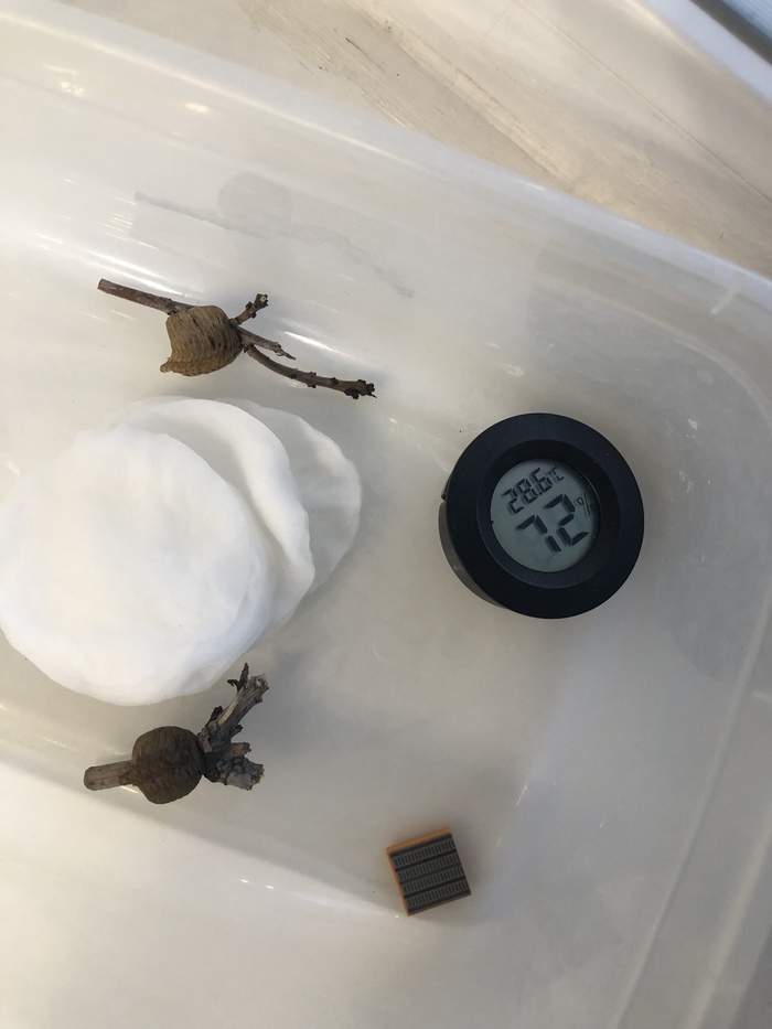 Перелет прошел хорошо, оотеки в контейнере с влажностью 40-60% и температурой около 25С. На термогигрометре сейчас больше, так как только капнули воды на ватку.