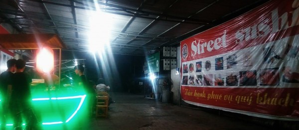 Мы едем в любимое место с суши. У Вьетнама репутация не самого гигиеничного места, но поверьте, не все так плохо. Я ни разу тут не отравилась, а ем бывает и в сомнительных на первый взгляд местах на маленьких пластиковых стульчиках. Тут ребята работают только вечером, вне жары, в одноразовых перчатках и все у них организованно аккуратно.