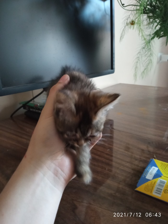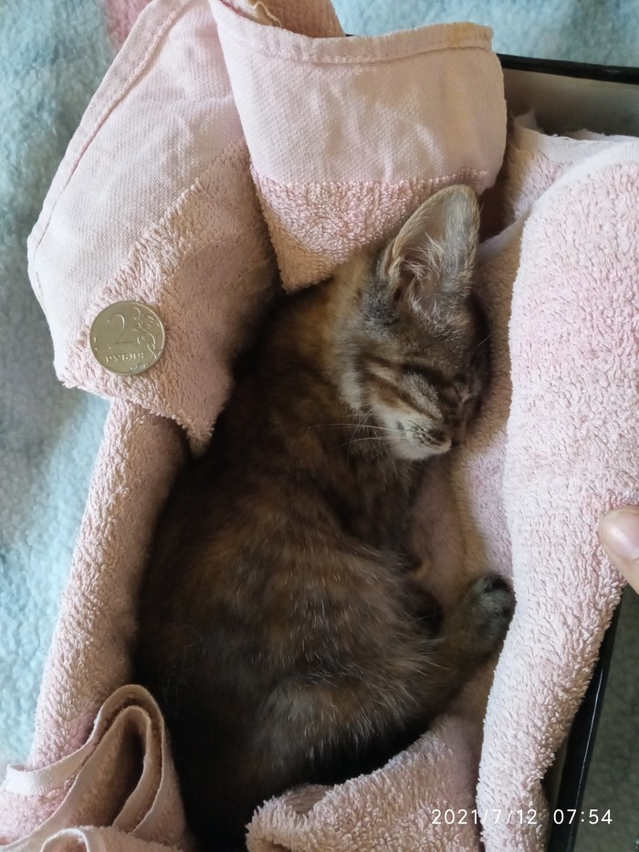 Подобрал кошечку на улице. Огромное желание жить в маленькой пискле. Тарахтит как трактор. К ветеринару отнесу чуть позже, как откроются и дополню ещё фотками и инфой.