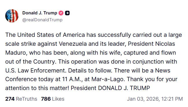 Соединенные Штаты Америки успешно провели крупномасштабную операцию против Венесуэлы и ее лидера, президента Николаса Мадуро, который вместе со своей женой был захвачен и эвакуирован из страны. Эта операция была проведена совместно с правоохранительными органами США. Подробности будут позже. Сегодня в 11:00 [19:00 по мск] в Мар-а-Лаго состоится пресс-конференция. Благодарим вас за внимание к этому вопросу!
