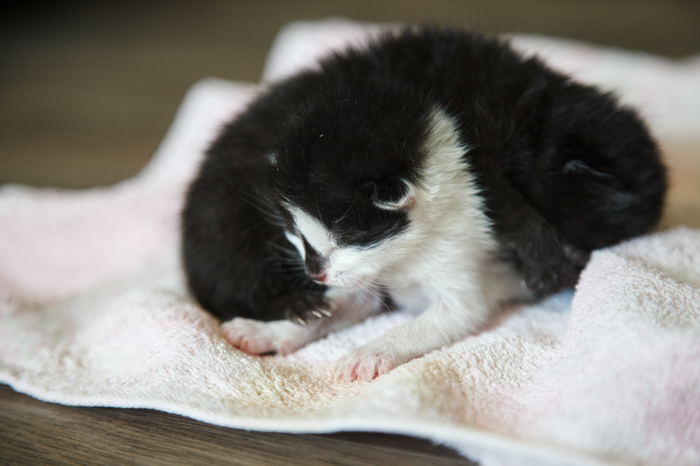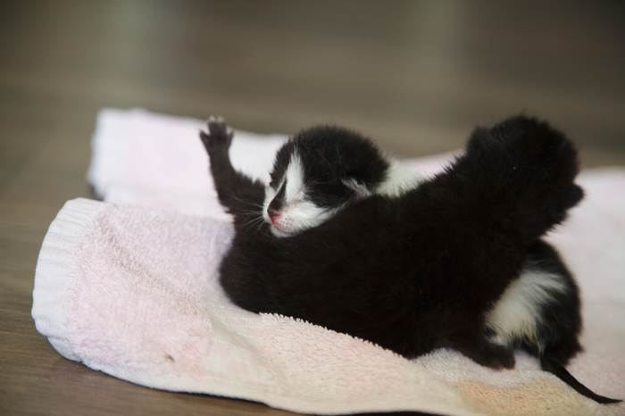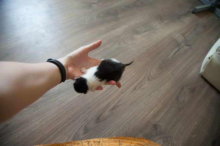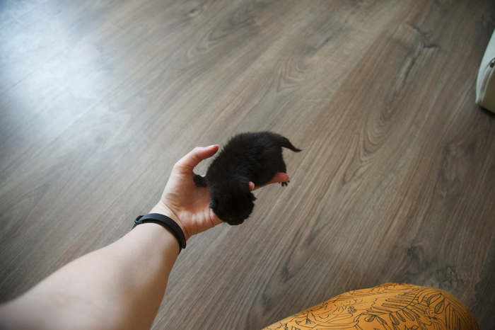 3-х месячный котенок с огромными ушами и лапищами только умилял, особенно спящим на ручках.
