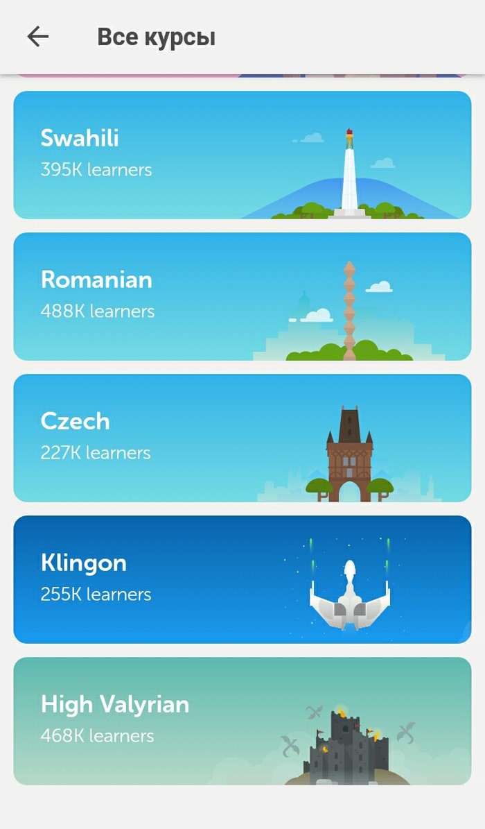 Думал шутка, проверяю доступные языки... в списке для англоговорящих куча языков, включая верхне-валирийский и клингонский. Обратите внимание на количество изучающих. WTF? Понимаю изучение мертвых языков, ну буй с ним, эсперанто... но что же должно в башке твориться, чтобы начать учить несуществующие языки...