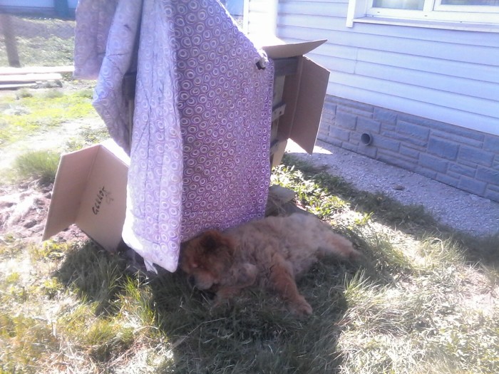 Майло было около 5-6 лет (по оценке ветеринара), поэтому играть он не желал. Но Малю это не слишком огорчало, она могла целыми днями валяться в траве, мусоля свои игрушки. Очень любила она находиться рядом с нами, когда я ухаживала во дворе за цветами или поливала овощи. Любила поворчать на метлу, когда муж подметал двор. Любила поиграть в догоняшки, гонять птичек, которые прилетали к собачьим мискам. Зимой в самые морозы Маля ночевала на теплой веранде, но повзрослев, она отказывалась заходить в дом и ночевала в своем отделении будки, рядом с Майло.
