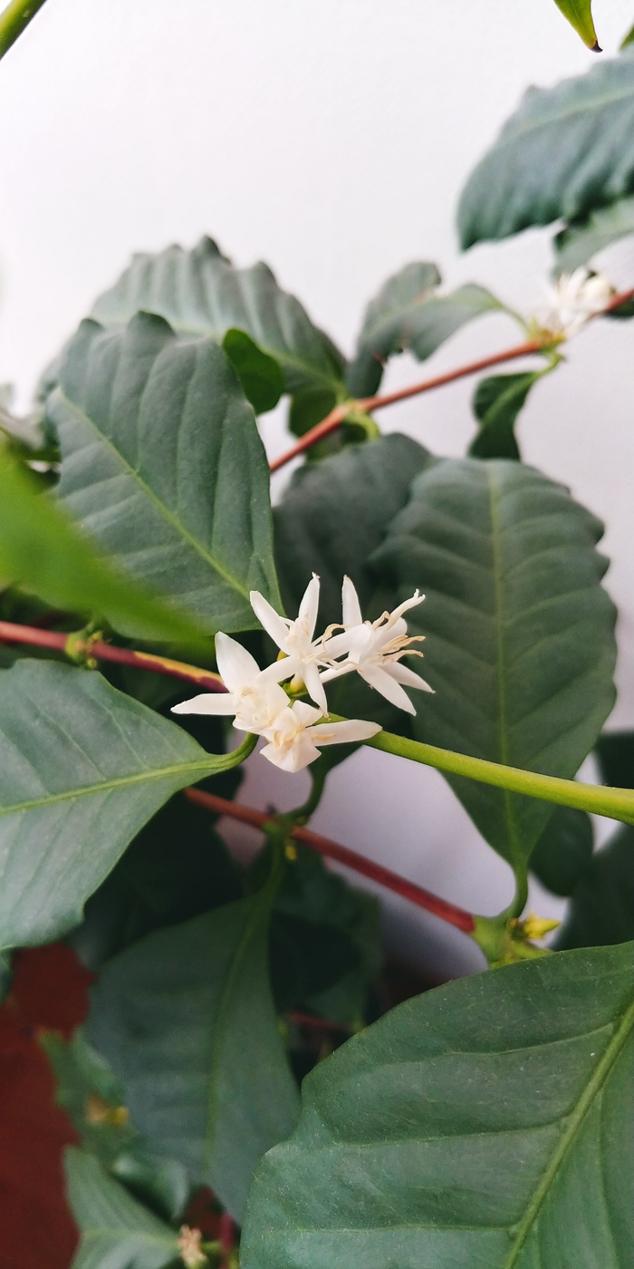 Давным давно я купила укорененный черенок кофе, обещали арабику. Дерево росло, росло, болело, его ел кот, замерзало при переезде, но наконец-то выросло и зацвело.