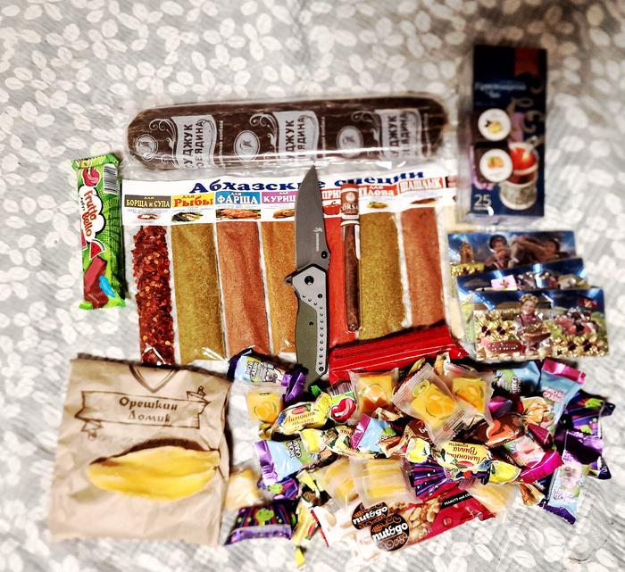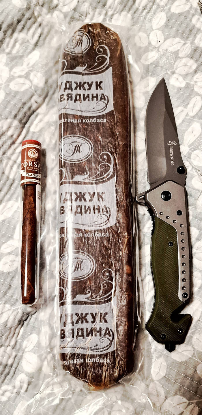 Фото получились несколько шакальные, извиняюсь. Знатный кусок мяса в виде суджука, краснодарский чай, специи (очень актуально и полезно), конфетное ассорти, пакет моего любимого вяленного манго, кубанские магниты на холодильник. Ножик в коллекцию! Браунинга у меня пока не было, теперь будет. Сигара будет скурена в Тайланде на отдыхе.