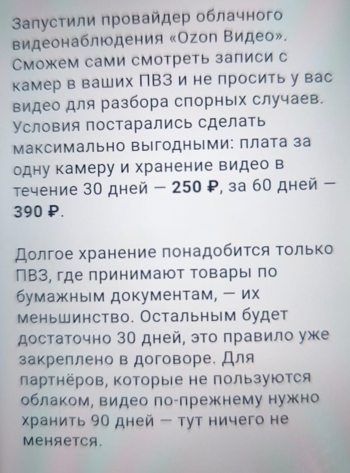 Сам озон просто закрыл чат по видеонаблюдению, очень жаль, раньше эта компания мне нравилась за их адекватность, а тут "поперёк батьки в пекло". Озон я верю в вас, пожалуйста разъясните ситуацию, спасибо. Люди (специалисты) которые подключали ПВЗ, пожалуйста поделитесь вашим мнением.