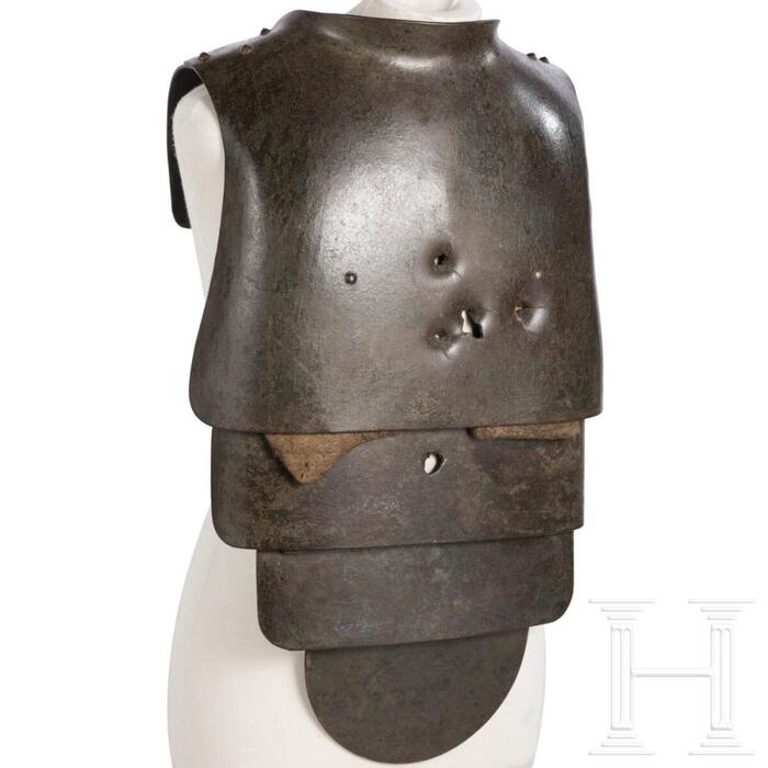 Траншейный стальной нагрудник, с боевыми повреждениями, Германия, 1918 год. Hermann Historica GmbH, Grasbrunn / Munich, Germany, 11 мая 2023. Начальная цена 1500 €.
