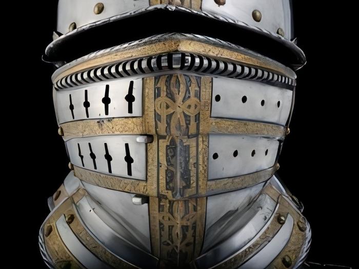 Доспехи Смайта состоят из кирасы, кольчужных рукавов, шлема бургонета и предличника,