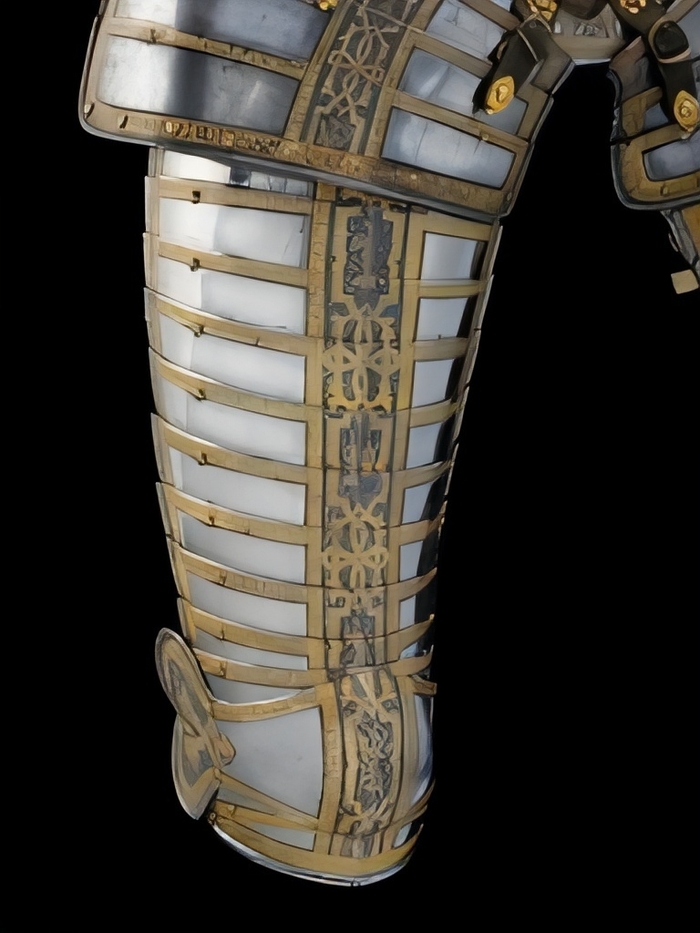 Гарнитур всадника дополняли стальные и накладки для седла и шаффрон (латная защита головы лошади).