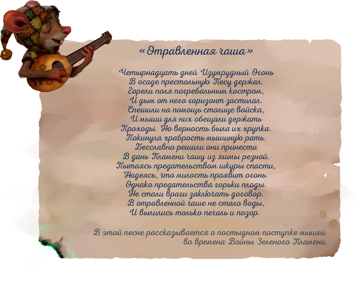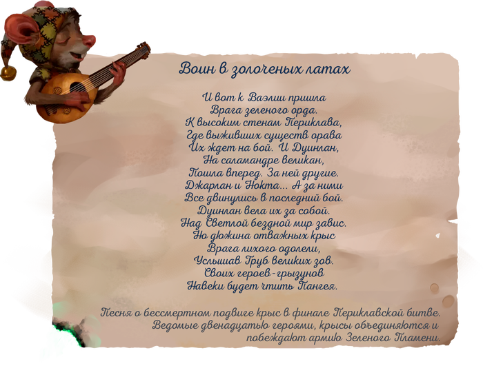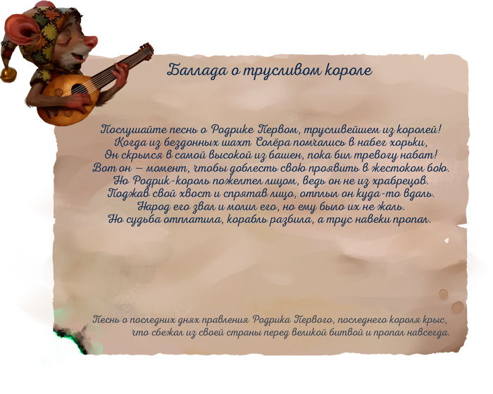 Вскоре у Тило и Мерры рождается ребенок. Всего один, что среди мышей большая редкость и считается добрым знаком. Новая жизнь и новая белая лутка. Мерра назвала его Брин, в честь персонажа из мышиного фольклора, мыша о трех головах, что сеет зерна надежды во снах. Впрочем, “брин” с муридейского также переводилось как “зерно”. Лютня лежала на чердаке, расстроенная и забытая и пускай иногда Тило снились звуки ее прекрасной песни, он был счастлив от той жизни которую имел и не скучал по вольной жизни менестреля.