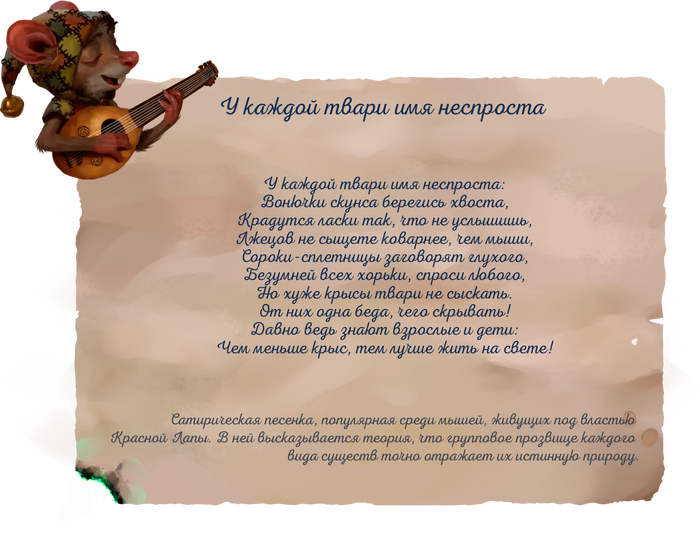 Ночь настигла мышиную деревню укрыв желающих остаться незамеченными от посторонних глаз. И не то, чтобы таких желающих обычно было много в этой тихой мирной деревушке, но так уж вышло, что в этот раз на одну крысу оказалось больше. Крысу звали Бриндис. Она была в плаще с капюшоном, прижимала к себе сверток, размером с дыню, и надеялась, что ее никто не узнает.