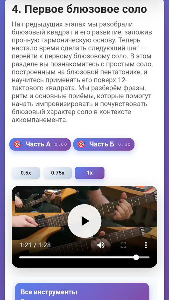 Так появился формат интерактивной школы игры на гитаре в блюзовом стиле. Сейчас готово четыре урока, ещё два находятся в работе.
