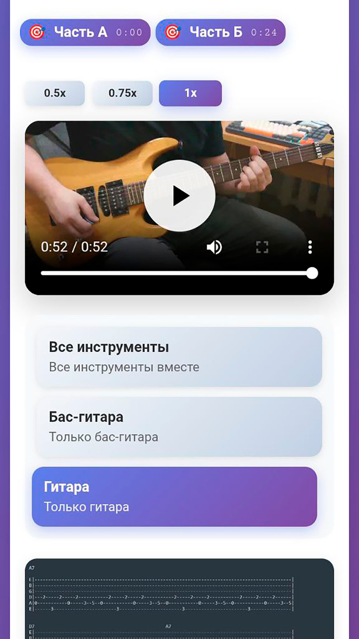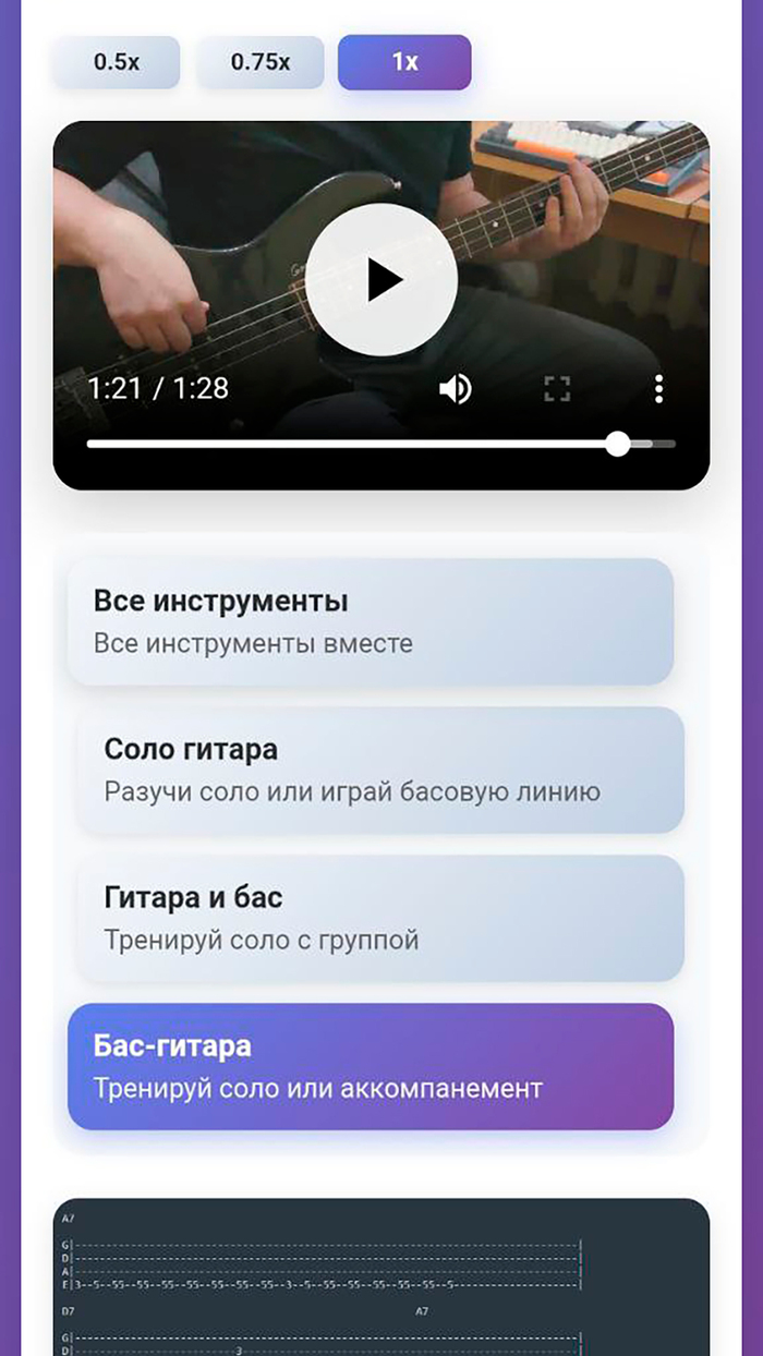 Это не просто видеоуроки, а тренажёр: можно, например, отключить бас и попробовать сыграть его самому, либо убрать гитару и играть свою партию под аккомпанемент.