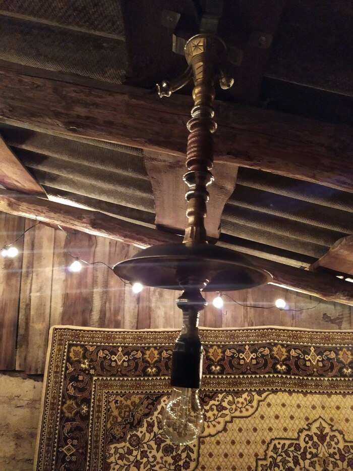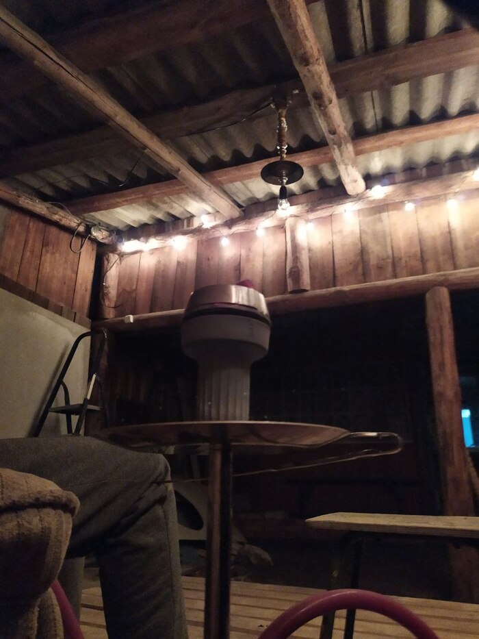 Для вайбового освещения заказал винтажную гирлянду и отдал старый кальян другу, чтобы сделал из него некое подобие люстры. Провели провода, всё подключили и развесили, результат был очень не плох))