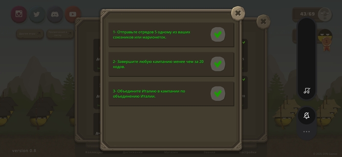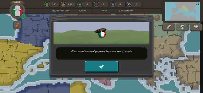 Сожрав Неаполь и несколько других стран герой стал правителем Италии. Также герой получает поддостижение и выполнив все остальные герой вставляет картинку и пишет:
