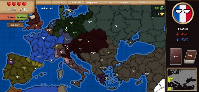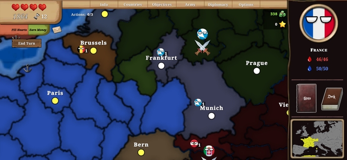 В этой игре какпо мне плохая система битв. Надо тупо сидеть и смотреть как дерутся и умирают солдаты без твоего участия. Можно было учитывать ведь в прошлой вышедшей игре countryball: Europe 1890 был интерактив в битвах.