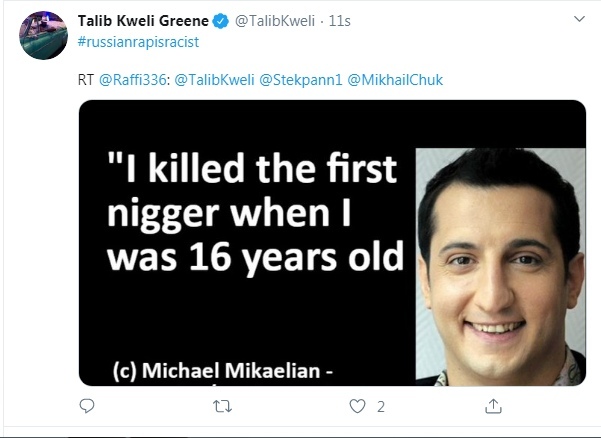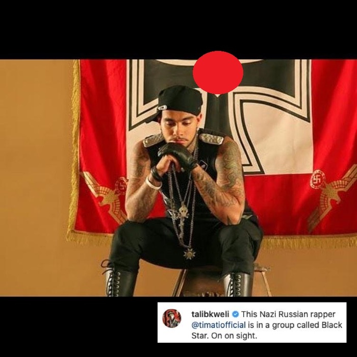 В чем все дело? У Талиба есть свой лейбл Black Star, так что неудивительно, что он пересекся с нашим артистом из РФ. Правда ситуация получилась абсурдной, с самого начала Талиб начал гнуть линию о нацизме Тимати, приложив в качестве примера кадр из фильма "Гитлер Капут". Пост бы и прошел бы незамеченным, если бы не активная реакция американца, который постил ответы, один другого страннее, почти на каждый троллинг-твит.