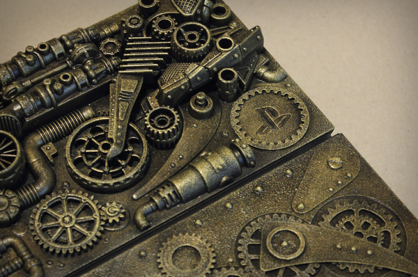 Далее - грунтовка и покраска (акрилом) в черный. Цветные элементы красил методом сухой кисти изумрудным, синим и белым цветами. Боковины затерты серым пигментом, хорошо известным всем, гм, самопальным юным пиротехникам.